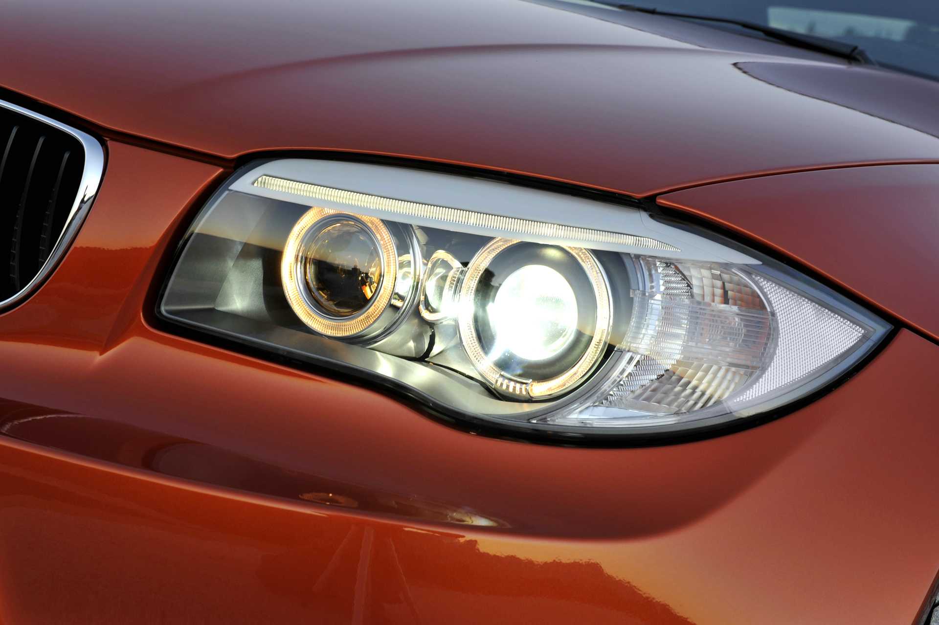 Ãptica esquerda (lado condutor) angel eyes 1M, adequadas para BMW série 1 E81 + E82 + E87 + E88, compatÃvel 06-12 (apenas p/ carros com xenon de origem). Cor: escurecido. Preparado para motor de regulação em altura eléctrico.