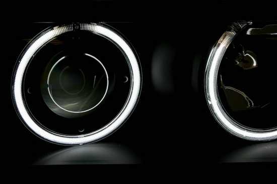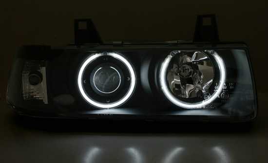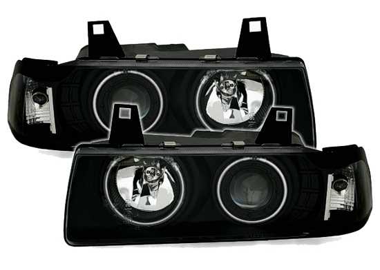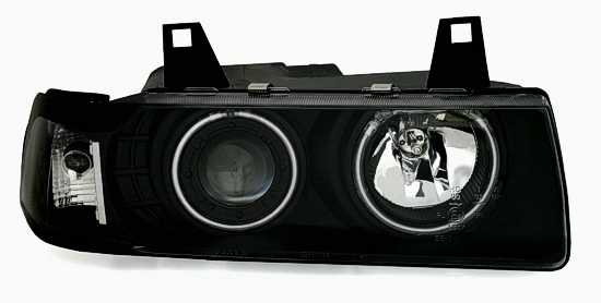 Ãpticas angel eyes CCFL, adequadas para BMW série 3 E36 (apenas Coupe + Cabrio). Cor: preto.Preparado para motor de regulação em altura eléctrico. Incl. Lâmpadas: H1/H3 + lâmpadas amarelas.Homologado.