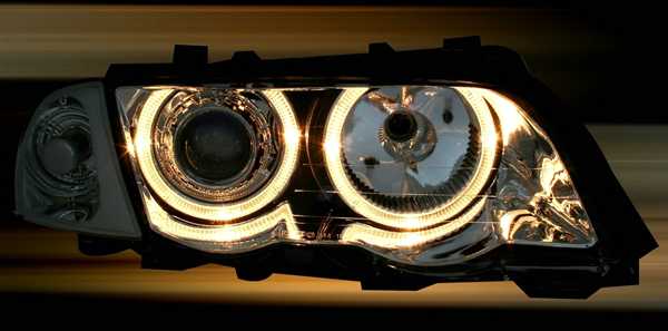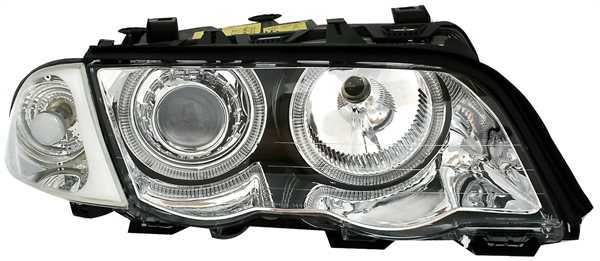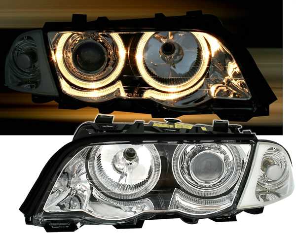 Ãpticas angel eyes, adequadas para BMW série 3 E46 (Limo + Touring), compatÃvel 5/98-8/01. Cor: cromado. Incl. motores para nivelamento eléctrico. Lâmpadas adequadas: H7/H7 (não incluÃdo).Homologado.