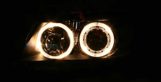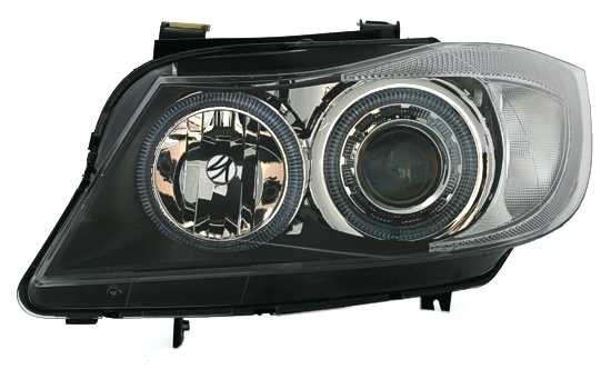 Ãpticas angel eyes, adequadas para BMW série 3 E90 Limo + E91 Touring, compatÃvel 1/05-1/09. Cor: preto. Preparado para motor de regulação em altura eléctrico. Lâmpadas adequadas: H7/H7 (não incluÃdo).Homologado.
