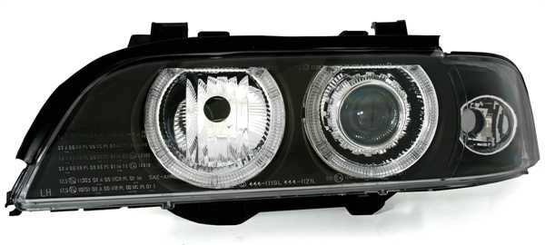 Ãpticas angel eyes, adequadas para BMW série 5 E39, compatÃvel 11/95-8/00 (carros sem Xenon). Cor: preto. Incl. motores para nivelamento eléctrico. Lâmpadas adequadas: H7/H7 (incluÃdas). Homologado.