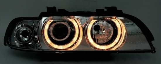 Ãpticas angel eyes, adequadas para BMW série 5 E39, compatÃvel 11/95-8/00 (apenas veÃculos com Xenon). Cor: cromado. Incl. motores para nivelamento eléctrico. Lâmpadas adequadas: D2S/H7 (não incluÃdo).Homologado.