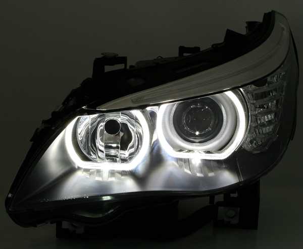 Ãpticas angel eyes, adequadas para BMW série 5 E60 + E61, compatÃvel 7/03-2/07 (apenas para veÃculos sem xenon). Cor: preto. Lâmpadas adequadas: H7/ H7/PY21W. Incl. motores para nivelamento eléctrico.Homologado.