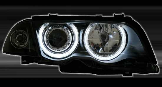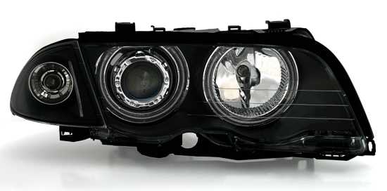 Ãpticas angel eyes, adequadas para BMW série 3 E46 (apenas Limo + Touring), compatÃvel 5/98-8/01 (apenas para veÃculos sem Xenon). Cor: preto. Incl. motores para nivelamento eléctrico. Incl. lâmpadas: Philips H7/H7.Homologado.