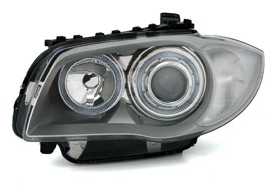 Ópticas angel eyes, adequado para BMW série 1 E81 + E82 + E87 + E88, compatível 9/04-10/11 (carros sem Xenon). Cor: Cinza prata. Preparado para motor de regulação em altura eléctrico. Lâmpadas adequadas: H7/H7 (não incluído).Homologado.