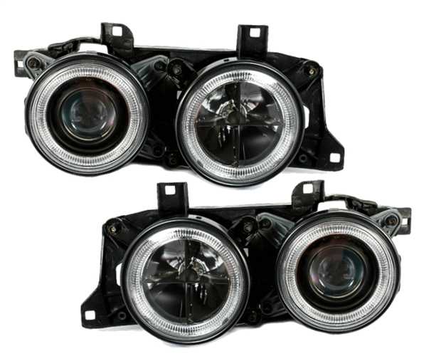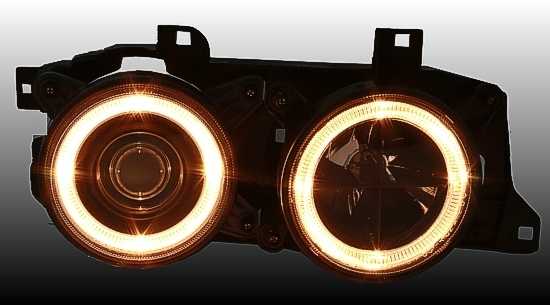 Ópticas angel eyes, adequadas para BMW série 5 E34, compatível 2/88-12/95, série 7 E32, compatível 10/86-5/94. Cor: preto. Lâmpadas adequadas: H1/H1 (não incluído). Preparado para controle de nivelamento manual e eléctrico.Homologado.