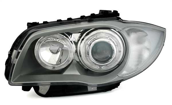 Ópticas angel eyes, adequado para BMW série 1 E81 + E82 + E87 + E88, compatível 9/04-10/11 (carros sem Xenon). Cor: Cinza prata. Preparado para motor de regulação em altura eléctrico. Lâmpadas adequadas: H7/H7 (não incluído).Homologado.
