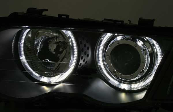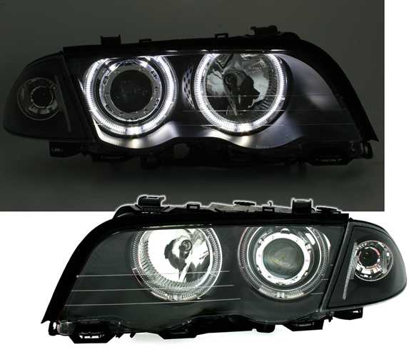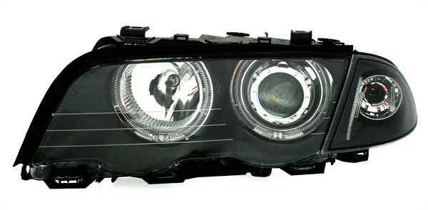 Ãpticas angel eyes, adequadas para BMW série 3 E46 (apenas Limo + Touring), compatÃvel 5/98-8/01 (apenas para veÃculos sem Xenon). Cor: preto. Incl. motores para nivelamento eléctrico. Incl. lâmpadas: H7/H7.Homologado.