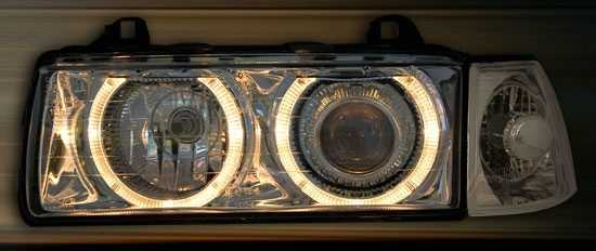 Ópticas angel eyes, adequado para BMW série 3 E36 Limo, compatível 9/90-2/98, Touring, compatível 1/95-10/99). Cor: cromado. Lâmpada adequada: H7/H7 (incluída). Homologado.