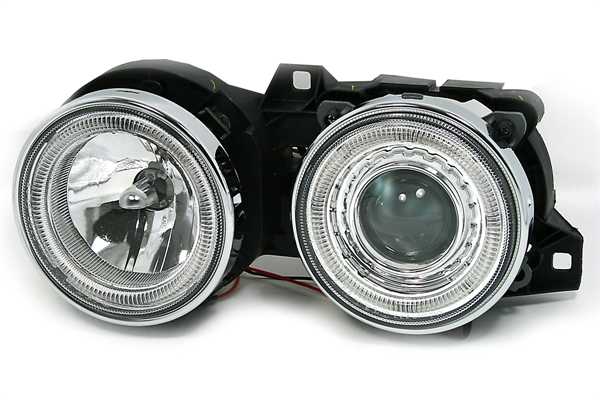 Ópticas angel eyes, adequadas para BMW série 3 E30, compatível 11/82-10/94. Cor: cromado. Lâmpadas adequadas: H1/H1 (não incluído). Preparado para o controle motor de regulação em altura eléctrico.Homologado.