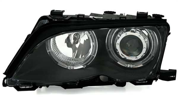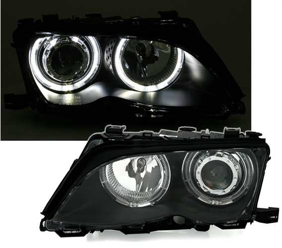 Ópticas angel eyes, adequadas para BMW série 3 E46 (apenas Limo + Touring), compatível 9/01-3/05 (carros sem Xenon). Cor: preto. Incl. motores para nivelamento eléctrico. Incl. lâmpadas: H7/H7. Não inclui piscas frontais.Homologado.