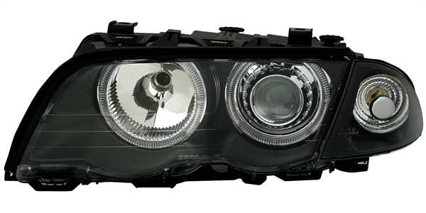 Ópticas angel eyes, adequadas para BMW série 3 E46 (Limo + Touring), compatível 5/98-8/01. Cor: preto. Incl. motores para nivelamento eléctrico. Lâmpadas adequadas: H7/H7 (não incluído).Homologado.