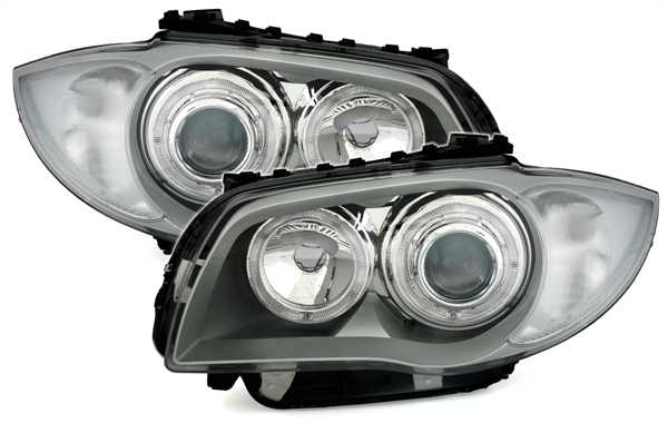 Ópticas angel eyes, adequado para BMW série 1 E81 + E82 + E87 + E88, compatível 9/04-10/11 (carros sem Xenon). Cor: Cinza prata. Preparado para motor de regulação em altura eléctrico. Lâmpadas adequadas: H7/H7 (não incluído).Homologado.
