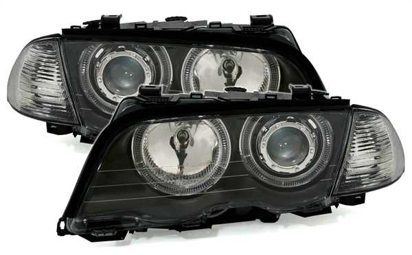 Ópticas angel eyes, adequadas para BMW série 3 E46 (apenas Limo + Touring), compatível 5/98-8/01 (apenas para veículos sem Xenon). Cor: cromado. Incl. motores para nivelamento eléctrico. Incl. lâmpadas: Philips H7/H7.Homologado.